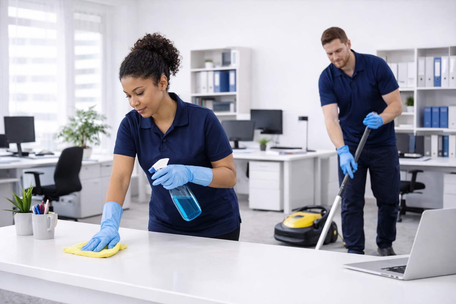 Un servicio de limpieza en oficinas incluye la limpieza de zonas de trabajo, suelos, aseos, áreas comunes y vaciado de papeleras, entre otras tareas.